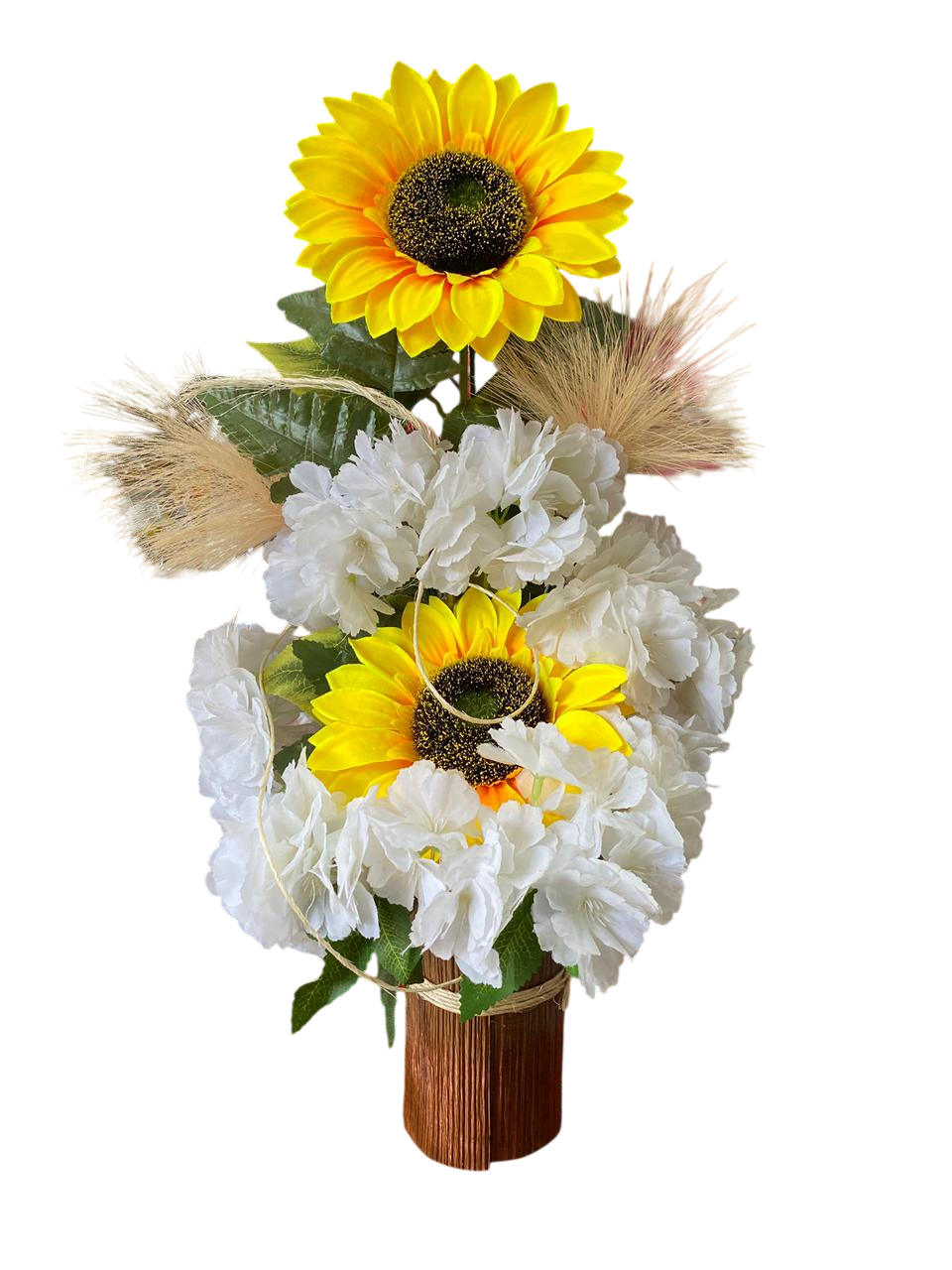 A combinação perfeita entre a alegria do girassol e a delicadeza das flores brancas.